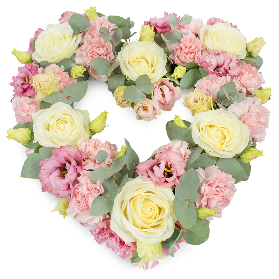 Celebrate cherished memories with our stunning open heart tribute. This exquisite arrangement features a harmonious blend of elegant white roses, soft pink carnations, and delicate pink lisianthus, gracefully complemented by lush eucalyptus leaves. Each flower is hand-selected for its freshness, ensuring a vibrant and lasting display.