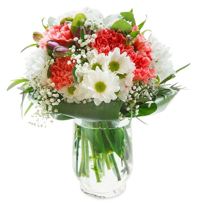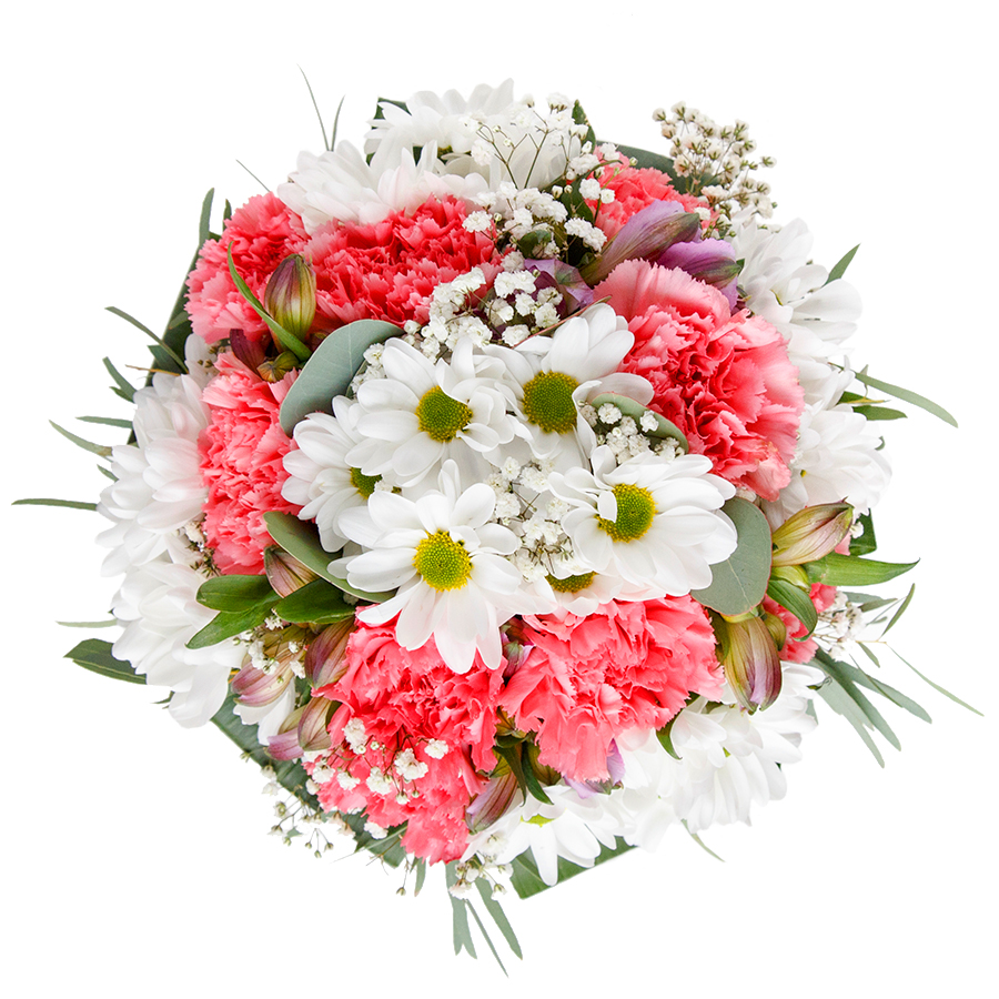 Experience the beauty and uniqueness of our exquisite bouquet, meticulously crafted to bring joy and elegance to any occasion. This arrangement features a harmonious blend of colors, including snow-white chrysanthemums, delicate gypsophila, soft light pink carnations, and lush aspidistra leaves.